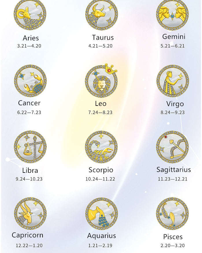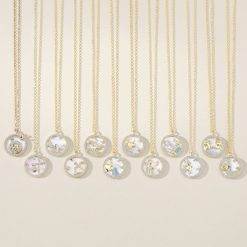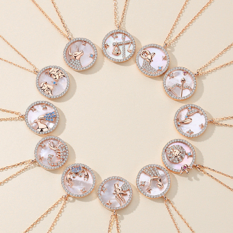 Embrace the cosmic beauty of the stars with our Twelve Constellation Mother of Pearl Sterling Silver Medal Pendant. Crafted from high-quality 925 sterling silver, this elegant pendant features a delicate zodiac constellation design set against a luminous mother of pearl backdrop, symbolizing celestial energy and personal destiny. Suspended from a dainty clavicle chain, this timeless piece is perfect for astrology lovers who appreciate refined and meaningful jewelry.